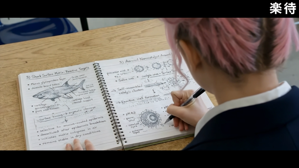 映像と一部の音声はAIで、その他は全て人力で作っています。脚本も自分で書いていて、その過程で補助的にAIを使っている形です。たとえば作中でサメをナノ分解する化学式が出てくるのですが、あれはAIに「極限までリアルにしてほしい」と指示して作ってもらいました。